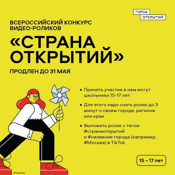 ПРИЕМ ЗАЯВОК НА ВСЕРОССИЙСКИЙ КОНКУРС ВИДЕО-РОЛИКОВ "СТРАНА ОТКРЫТИЙ" ДЛЯ ШКОЛЬНИКОВ 15-17 ЛЕТ ПРОДЛЕН ДО 31 МАЯ