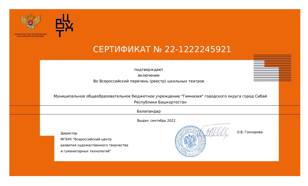 НАШ ШКОЛЬНЫЙ ТЕАТР "БАЛАПАНДАР" ВКЛЮЧЕН ВО ВСЕРОССИЙСКИЙ ПЕРЕЧЕНЬ (РЕЕСТР) ШКОЛЬНЫХ ТЕАТРОВ