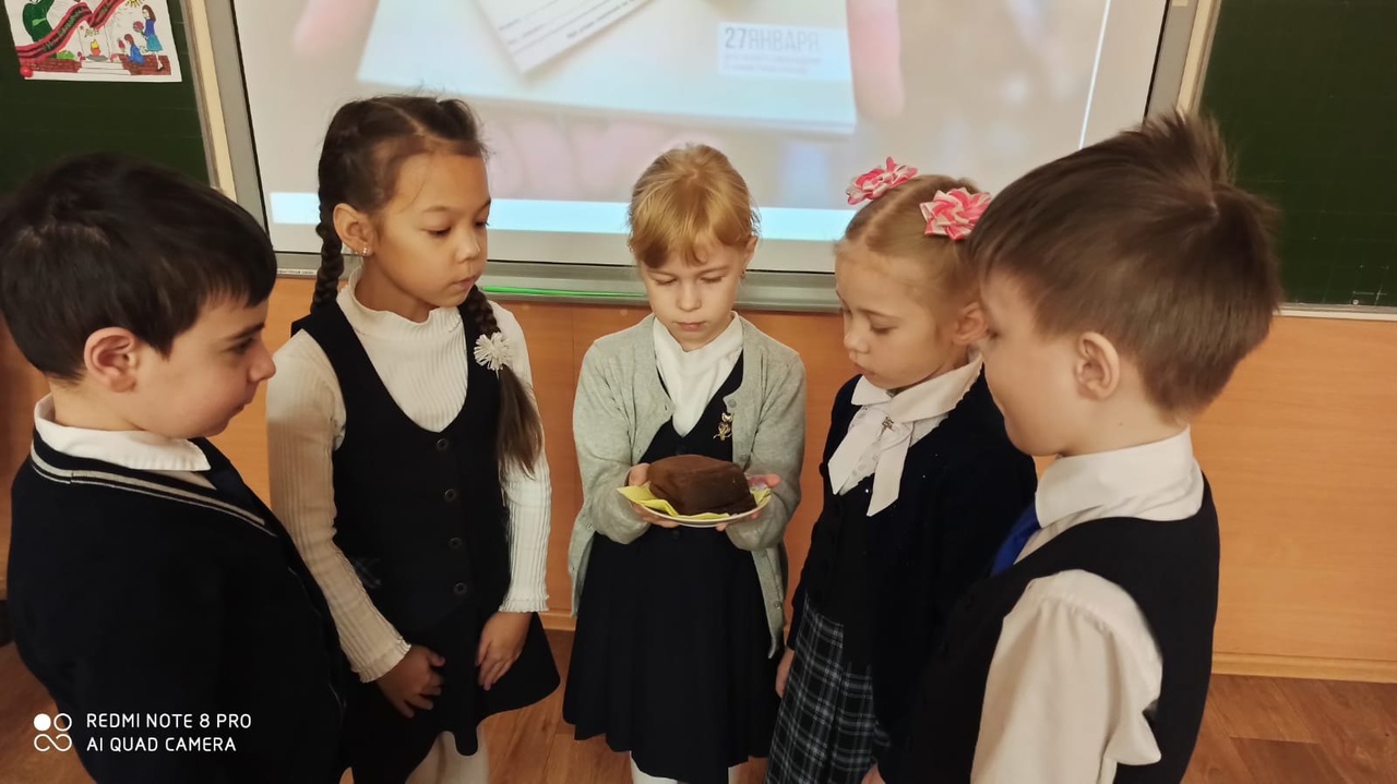 Первоклассники наглядно увидели кусочек хлеба, который на протяжении многих блокадных дней оставался для человека единственным источником жизни и единственной надеждой.