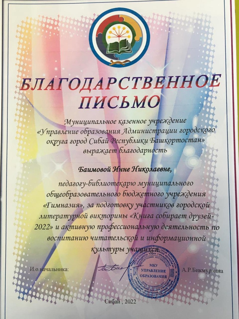 под руководством педагога-библиотекаря Баимовой Инны Николаевны заняла II место. Поздравляем!