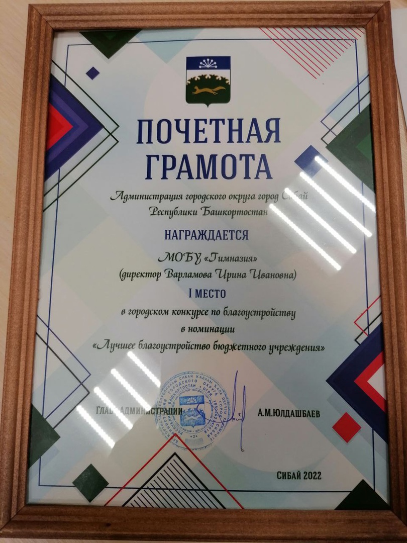 НАША ГИМНАЗИЯ НАГРАЖДЕНА ПОЧЕТНОЙ ГРАМОТОЙ АДМИНИСТРАЦИИ ГОРОДСКОГО ОКРУГА ЗА I МЕСТО В НОМИНАЦИИ "лУЧШЕЕ БЛАГОУСТРОЙСТВО БЮДЖЕТНОГО УЧРЕЖДЕНИЯ" ПО ИТОГАМ ГОРОДСКОГО КОНКУРСА ПО БЛАГОУСТРОЙСТВУ